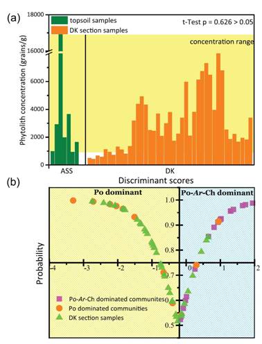 图2. 松嫩草原表土植硅体组合与代克剖面植硅体组合对比(a)植硅体浓度对比;(b)判别分析结果
