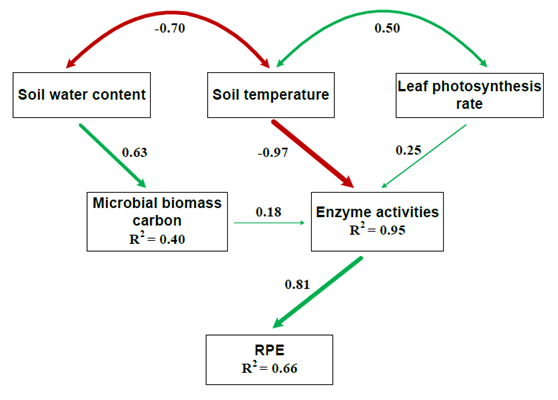 图2.结构方程模型揭示了遮阴导致的土壤体积含水量、土壤温度、叶片光合速率、微生物生物量碳和碳获取酶的活性的变化对根际激发作用的影响。
