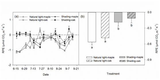 基于此,生物地球化学组采用13C天然示踪法,通过野外盆栽实验进行为期4个月的遮阴处理,分析了遮阴对两个温带森林优势物种(耐阴物种色木槭和喜光物种蒙古栎)根际激发效应的影响。结果表明,遮阴可以通过影响植物的光合速率、土壤温度和水分显著地改变根际微生物生物量和酶的活性,最终影响根际激发效应和土壤有机质的分解,并且这种影响不依赖于树种类型。在自然光条件下,根际激发普遍表现为负激发效应,而在遮阴条件下,表现为更多地向正向改变(图1)。植物和微生物的氮竞争可解释根际的负激发效应。遮阴下碳获取酶的活性提升,植物光合速率的降低以及土壤含水量的升高可能共同降低了根际负激发效应(图2)。该研究同时也强调了分析土壤微生物生物量和酶的活性在研究根际激发效应对遮阴或其他环境变化的响应机制时的重要性。