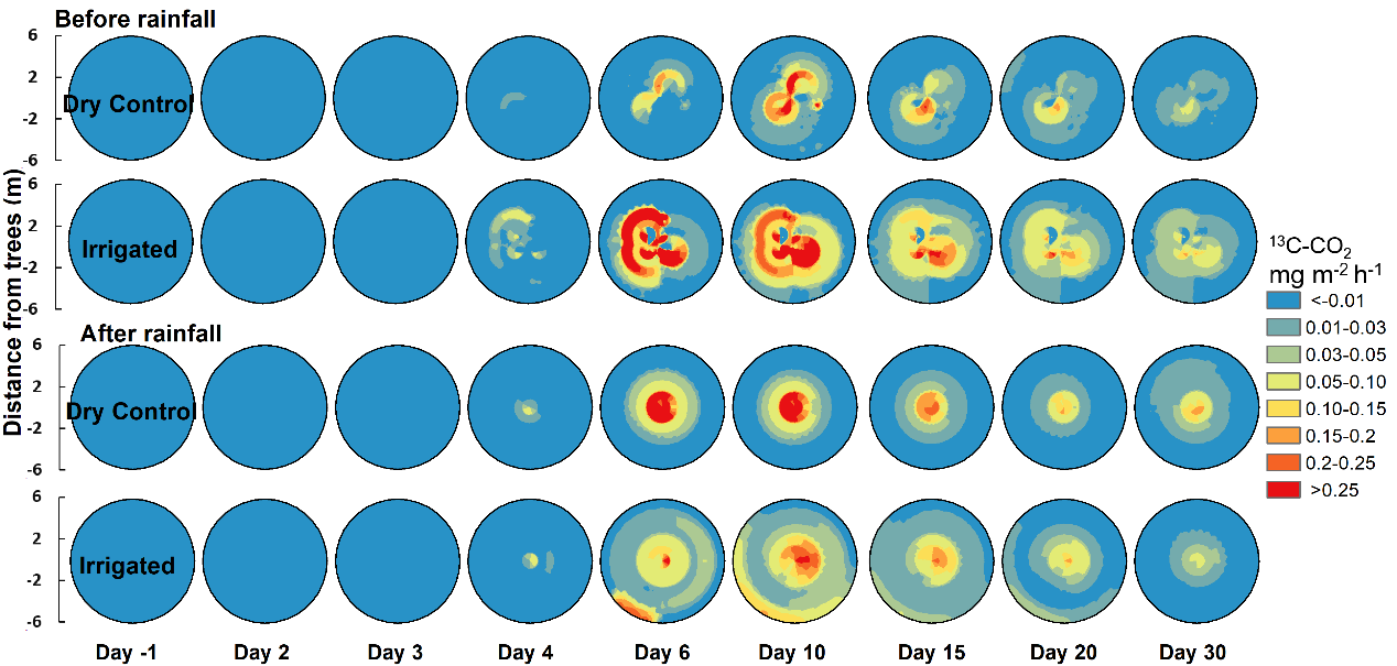 基于此,我院高德才博士与瑞士研究人员合作,在长期干旱平台上,野外原位条件下用13CO2同位素气体标记100年左右的成熟大树,探究干旱如何影响光合产物从树到土壤的转化和利用。结果表明,13C标记的光合产物在标记后的第四天可由叶片分配到根际土壤中,标记一年后仍然可在树干和土壤呼吸中监测到13C信号,表明部分光合产物可储层在树中。在标记后的十天内,灌溉可显著增加光合产物转移到土壤中的数量,增幅可达370%,然而一次小的降水事件使土壤重新湿润,可迅速改变这种模式,使这种增幅的大小减少到35%。通过绘制10个带有13C标记的树木周围土壤呼吸13CO2的时空分布图得出,树木的根际横向延伸超过树冠2.8倍,这表明相邻树木之间的根际有很强的重叠,灌溉使根际面积增加了60%,这提供了树木及其根际长期适应干旱状况的证据(图1)。在根际中水分敏感型碳的转移和利用对树木,土壤微生物群落和土壤碳储量中碳的分配产生了影响。