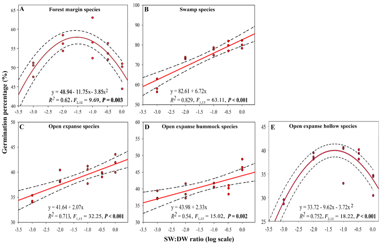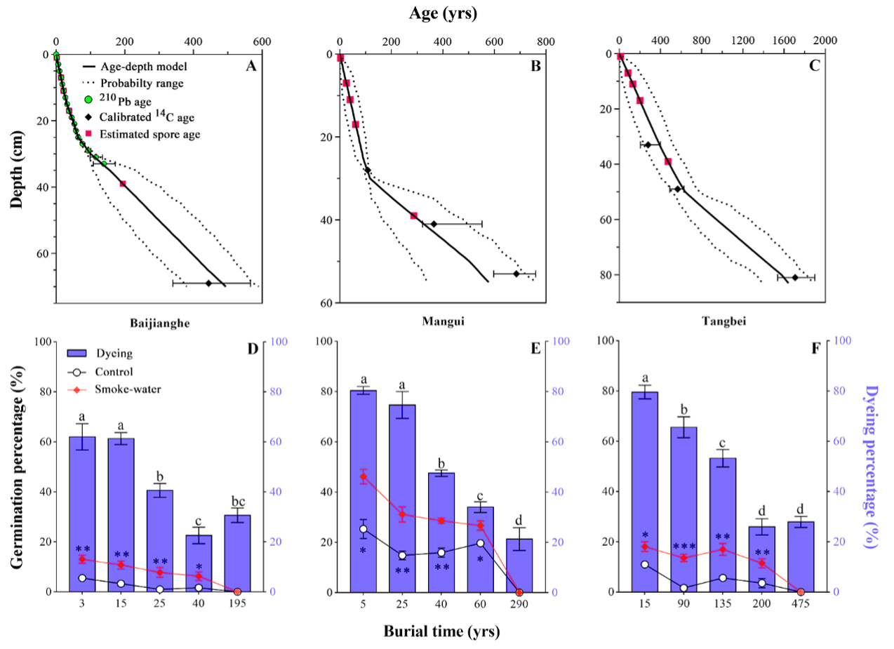 为了研究烟雾在火灾后泥炭地恢复中的潜在作用,卜兆君研究组夏尤普·玉苏甫博士以长白山泥炭地常见的15种苔藓植物孢子为对象,测试了苔藓植物在烟溶液处理后的孢子萌发情况。随后测试了不同实验室储存时间和埋藏深度/年龄(3–200年)的孢子之间的烟雾响应性。结果显示烟溶液增加10种泥炭地苔藓物种的萌发率,并促进其中4种的萌发速度。孢子烟响应性萌发随着从泥炭地开阔地到森林边缘的火灾频率梯度而增加,这与维持火灾适应特性的理论一致。烟雾增强了实验室储存1年而不是4年的孢子的萌发能力。然而,烟雾显著提高了泥炭中自然埋藏长达200年的孢子萌发力。这说明在相同的火灾干扰下,不同物种、不同年龄和不同保存时间的孢子表现出不一样的响应。因此,火灾频率的增加可能会导致物种优势的转变,这可能会影响泥炭地的长期碳汇功能。