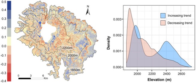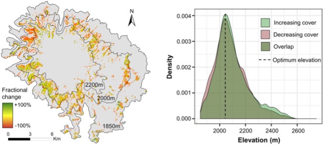 由此,我院宗盛伟教授基于遥感技术和实地观测数据,提取了长白山苔原带近 50 年春季雪被覆盖变化信息和近 30 年高山常绿灌木植物牛皮杜鹃分布范围变化,并进行分析。经研究发现,长白山苔原带春季融雪面积不断减小(图1),牛皮杜鹃分布范围整体向高海拔迁移(图2),其在海拔梯度上的变化格局与雪被覆盖的增减趋势一致。该研究首次构建了 50 年尺度的高山积雪变化数据,并首次通过高山植物的典型物候特征提取了其分布范围。研究通过建立雪被变化与高山植物分布变化的关系,以长时间尺度时间数据证明在高山地区植物分布变化研究中,除考虑温度因素外,还应考虑温度影响下的雪被变化的影响。