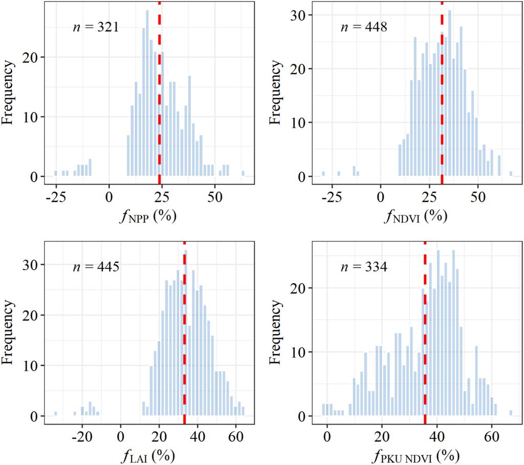 近几十年来,中国黄土高原的植被变绿主要受到一系列植被恢复计划(Vegetation restoration programs, VRPs)和其他自然环境变化(包括气候变化、大气CO2浓度上升和氮沉降等)的驱动。然而,由于缺乏不同地区VRPs政策开始实施的确切时间,准确估算自然环境变化和VRPs对绿化的贡献一直是一项挑战。