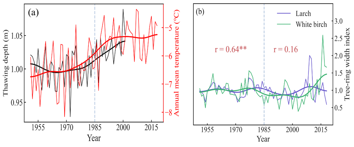 图1. 研究区(a)冻土融化深度与年平均气温的变化,(b)树木径向生长的变化