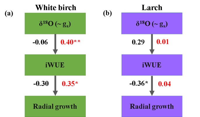(a)白桦和(b)落叶松的iWUE对径向生长的潜在影响