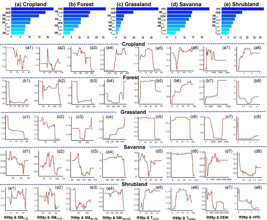 基于此,本研究基于2001-2020年全球逐日降水数据,评估了11个极端降水指数对全球归一化植被指数(NDVI)的时间影响,并利用增强回归树(BRT)模型考察了各因素对植被的时间响应的贡献度和阈值。