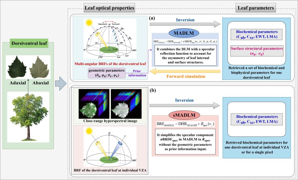为了解决叶片内部和表面结构的不对称性,本研究提出了一种改进的DLM模型(MADLM)。该模型基于微面元理论,将叶片正反两面的多角度反射与表面结构参数(粗糙度和折射率)相关联(图1(c)),用于模拟异面叶的多角度反射光谱。通过在主平面和半球空间内的多角度反射光谱数据集,对MADLM模型的光谱模拟与生化参数反演精度进行了评估。结果表明,MADLM模型能够高精度地模拟叶片正反两面的多角度反射光谱,并在所有观测几何条件下准确反演异面叶生化和结构参数(图2(a))。