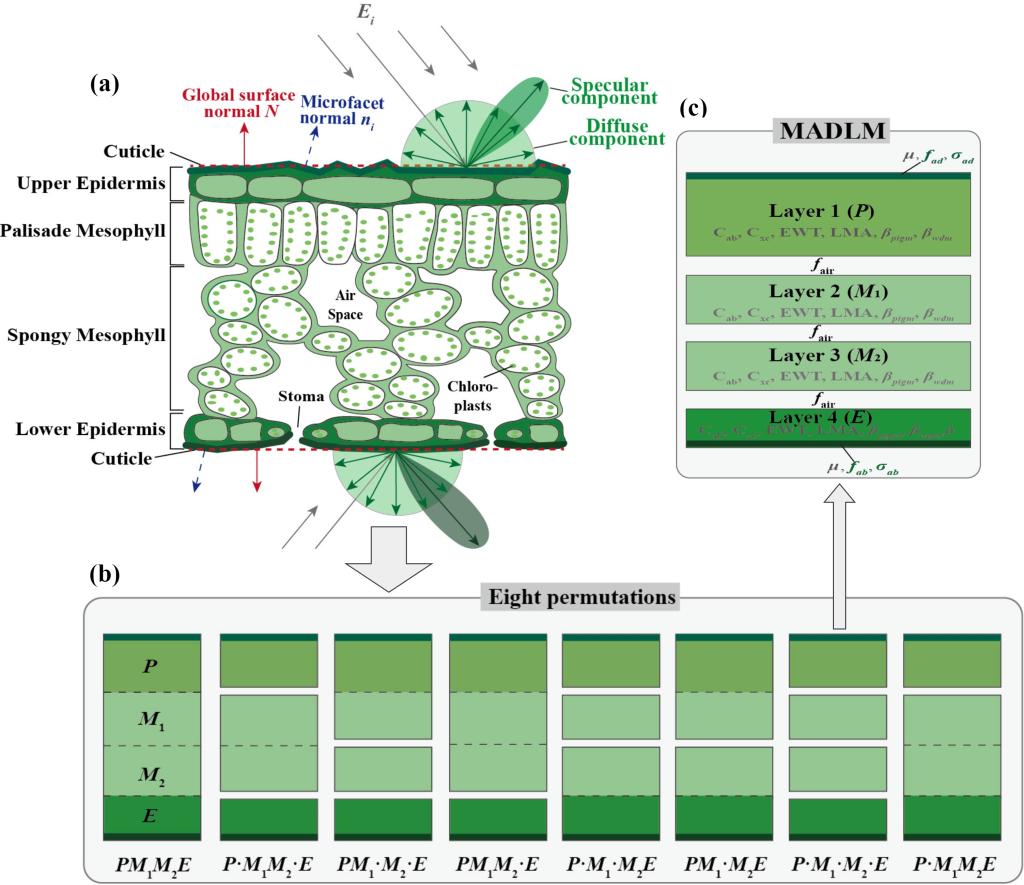 以上研究成果以“An advanced dorsiventral leaf radiative transfer model for simulating multi-angular and spectral reflection: Considering asymmetry of leaf internal and surface structure”为题发表于Remote Sensing of Environment期刊。我院博士研究生冉东杰为第一作者,孙仲秋教授和卢珊教授为通讯作者,东京大学名誉教授Kenji Omasa为主要合作者。该研究得到了国家自然科学基金、中央高校基础研究基金和吉林省科技发展计划项目等的支持。