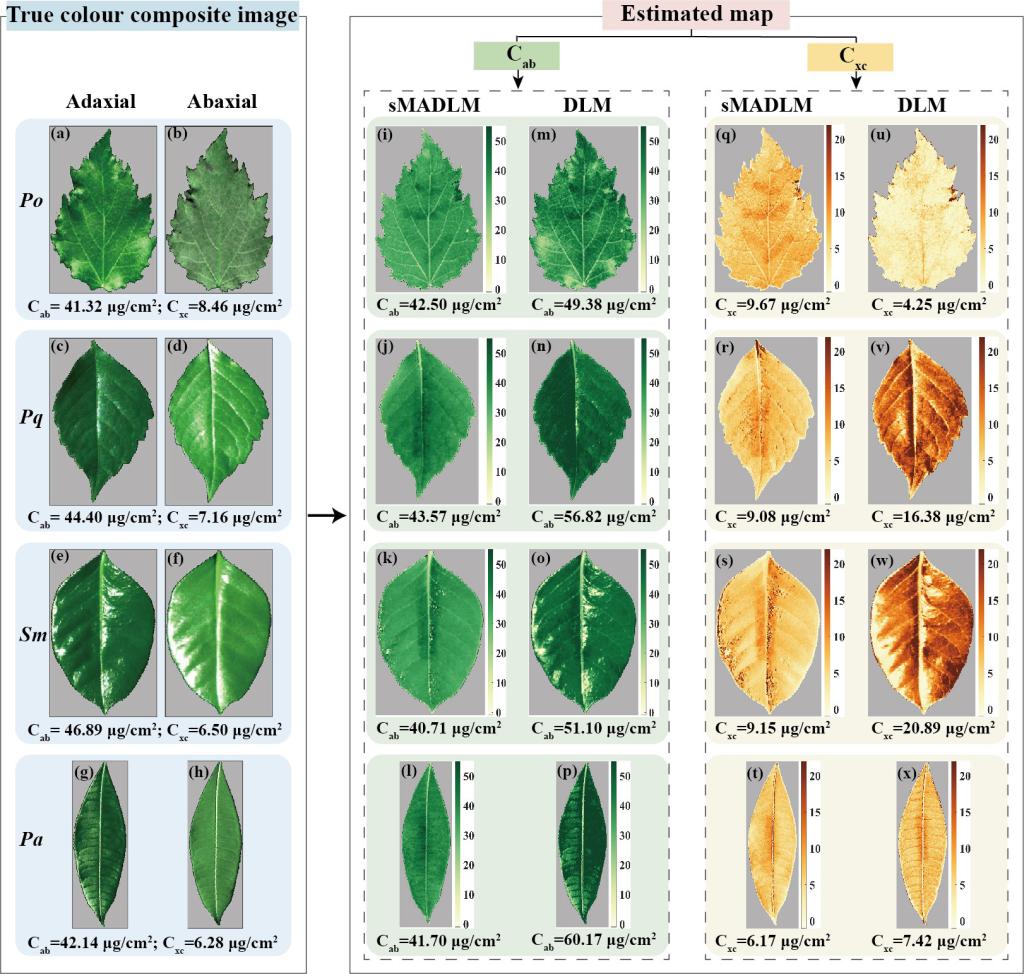 (前两列为叶片正面和反面的真彩色合成图像,中间两列分别为sMADLM (i-l) 和DLM (m-p) 估算的叶绿素含量分布图,