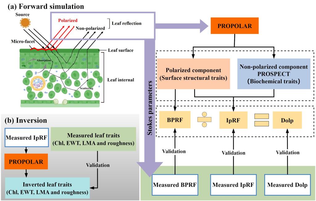准确表征叶片光学特性与叶片特征参数之间的关系,是利用遥感数据有效反演叶片特征参数的关键。叶片反射光学特性包括光强和偏振,二者共同表征植被辐射传输过程。结合光强与偏振特性,对于叶片反射光学特性的准确表征和参数的有效反演至关重要。然而,现有模型多侧重单一成分,缺乏综合性辐射传输模型。