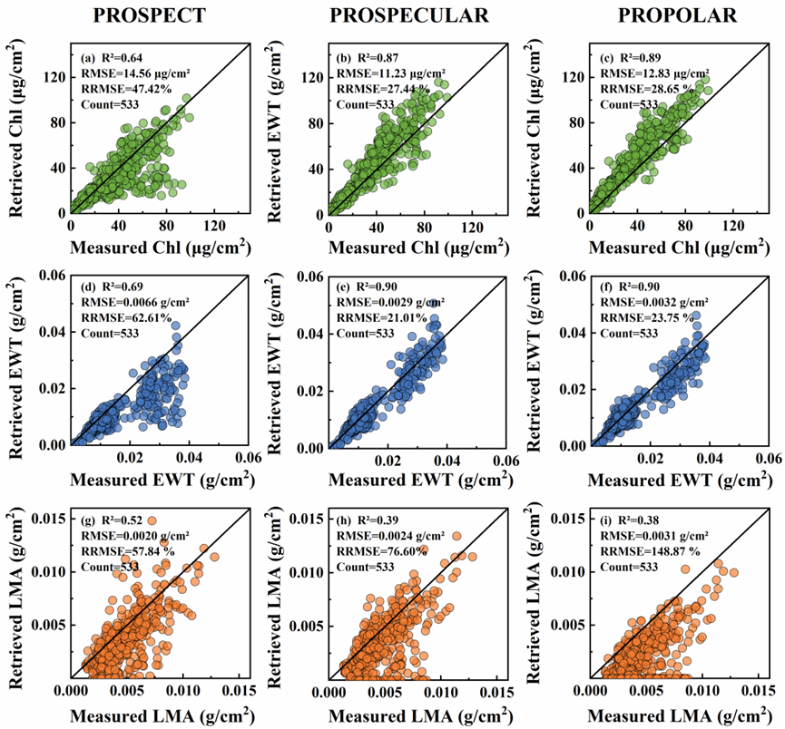 为了有效结合叶片的光强和偏振反射特性,本研究构建了一个综合的辐射传输模型PROPOLAR(图1)。该模型将非偏振模型PROSPECT与偏振函数结合,用于叶片光强与偏振反射特性的表征及生化和表面结构特征的反演。基于多物种叶片样本数据集(反射强度、偏振数据及特征参数),验证了PROPOLAR模型的模拟和反演性能。结果表明,PROPOLAR显著提高了多角度反射光强模拟的精度(R² = 0.98,图2),成功模拟了偏振反射系数(R² = 0.92,图3(a)和(c))及线性偏振度(R² = 0.80,图3(b)和(d))。在生化参数反演方面,PROPOLAR提升了叶绿素(R² = 0.89,RMSE = 12.83 μg/cm²)、等效水厚度(R² = 0.90,RMSE = 0.0032 g/cm²)和叶片干物质含量(R² = 0.38,RMSE = 0.0031 g/cm²)的反演精度,同时有效反演叶片粗糙度(R² = 0.61)。PROPOLAR模型结合了光强和偏振特性,并将其与叶片生化特性与表面结构等参数相关联,为光学遥感在植被参数估算中的应用提供了重要支持。