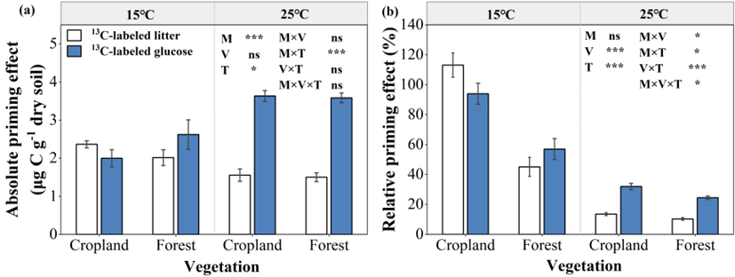 研究成果以“Temperature effects on microbial carbon use efficiency and priming effects in soils under vegetation restoration”为题发表在Catena期刊上。生物地球化学组博士生杨静怡、王梓橦为共同第一作者,白娥教授为通讯作者。该研究得到国家自然科学基金、重点研发计划、中央高校基本科研业务费和吉林省教育厅自然科学基金的支持。