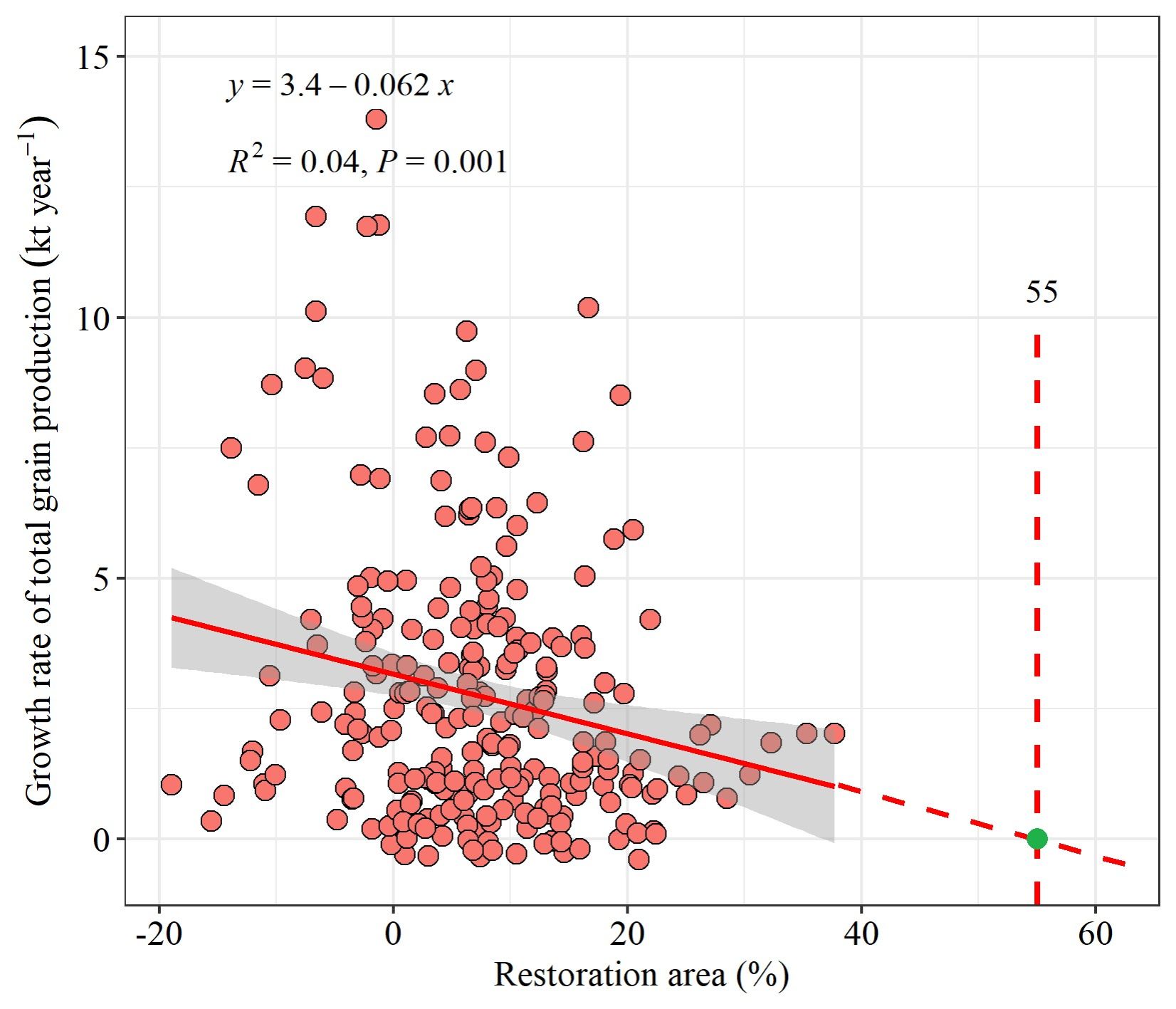 图4 粮食总产量年增长率与恢复面积的关系。