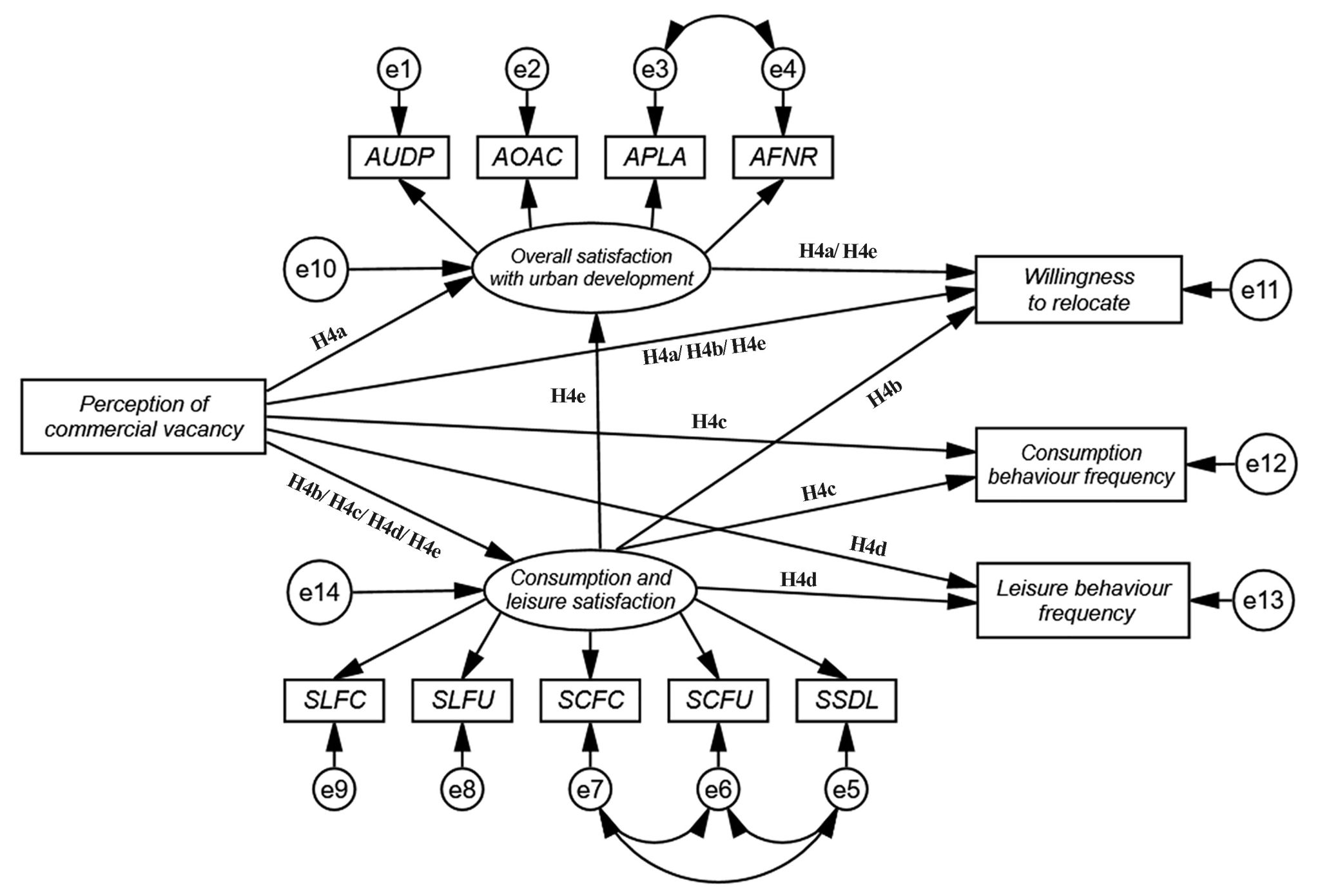 结果表明,整体上,居民对城市空置按照“感知—态度—行为”的路径进行传导和响应(图2),行为响应分为两种类型:一种是通过搬迁的方式“逃离”收缩城市的空置空间和荒凉的环境氛围;一种是降低城市内休闲、消费等活动的参与频率“回避”无序空间。居民对不同类型城市空置的感知将形成差异化的传导路径。对住宅空置的感知降低城市发展整体满意度,进而增强其迁居意图(图3);对空地的感知集中表现为对社区环境和随之滋生的卫生问题的担忧,而非犯罪恐惧(图4);对商业空置的感知不仅通过抑制消费与休闲满意度降低居民商业空间与休闲空间的到访频率,还通过消费与休闲满意度和城市发展整体满意度形成的链式中介作用于居民迁居行为(图5)。不同年龄、教育水平、收入水平、居住时长的受访者行为响应表现出路径差异性。研究结果为收缩城市空置如何影响居民感知与行为提供了理论解释,针对失序空间的清理、改造、空间再利用和合理布局商业设施将是提升居民满意度与城市活力的有效措施。
