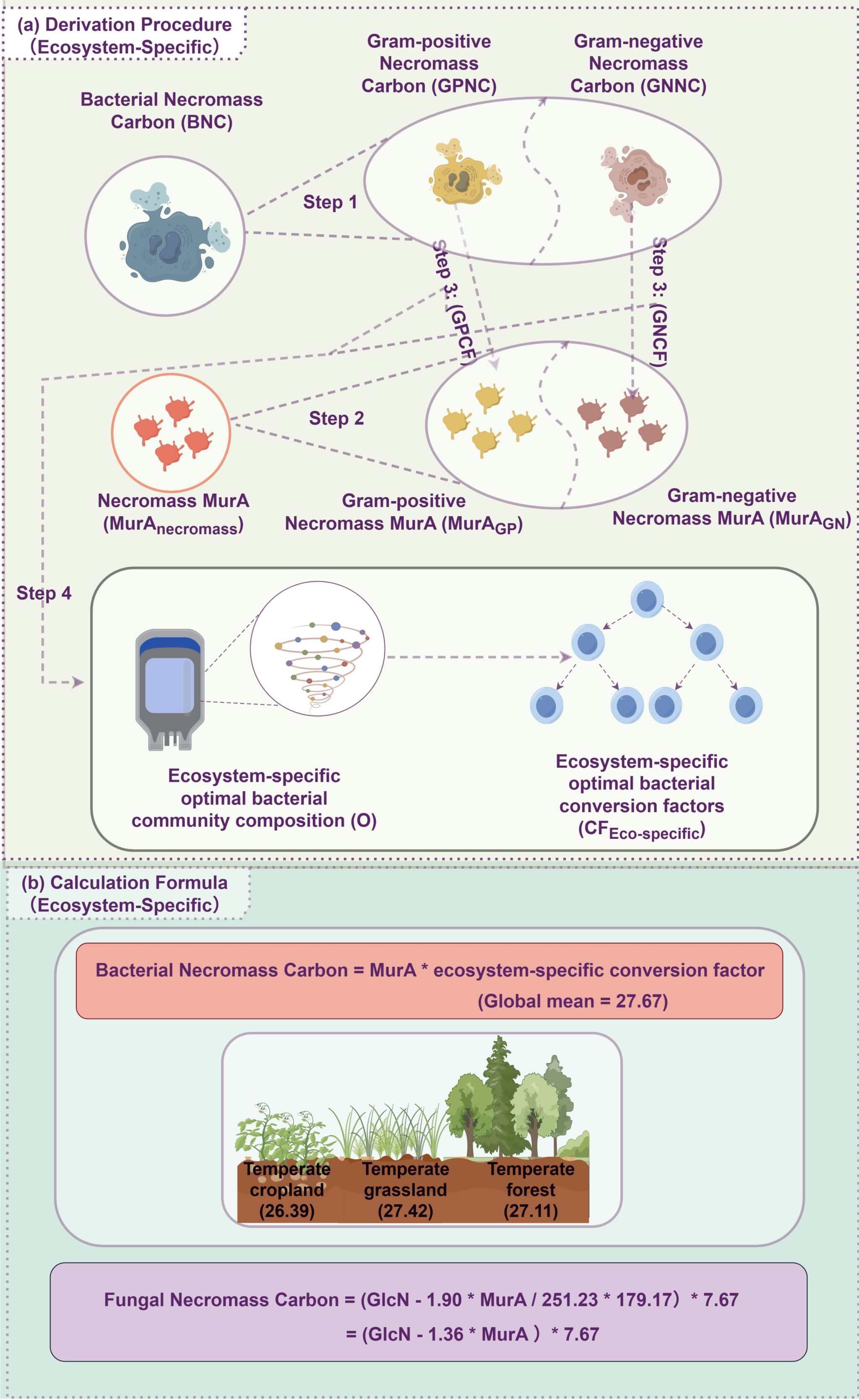 图 3 不同生态系统中由胞壁酸(MurA)推导细菌残体碳(BNC)最优转换系数的过程