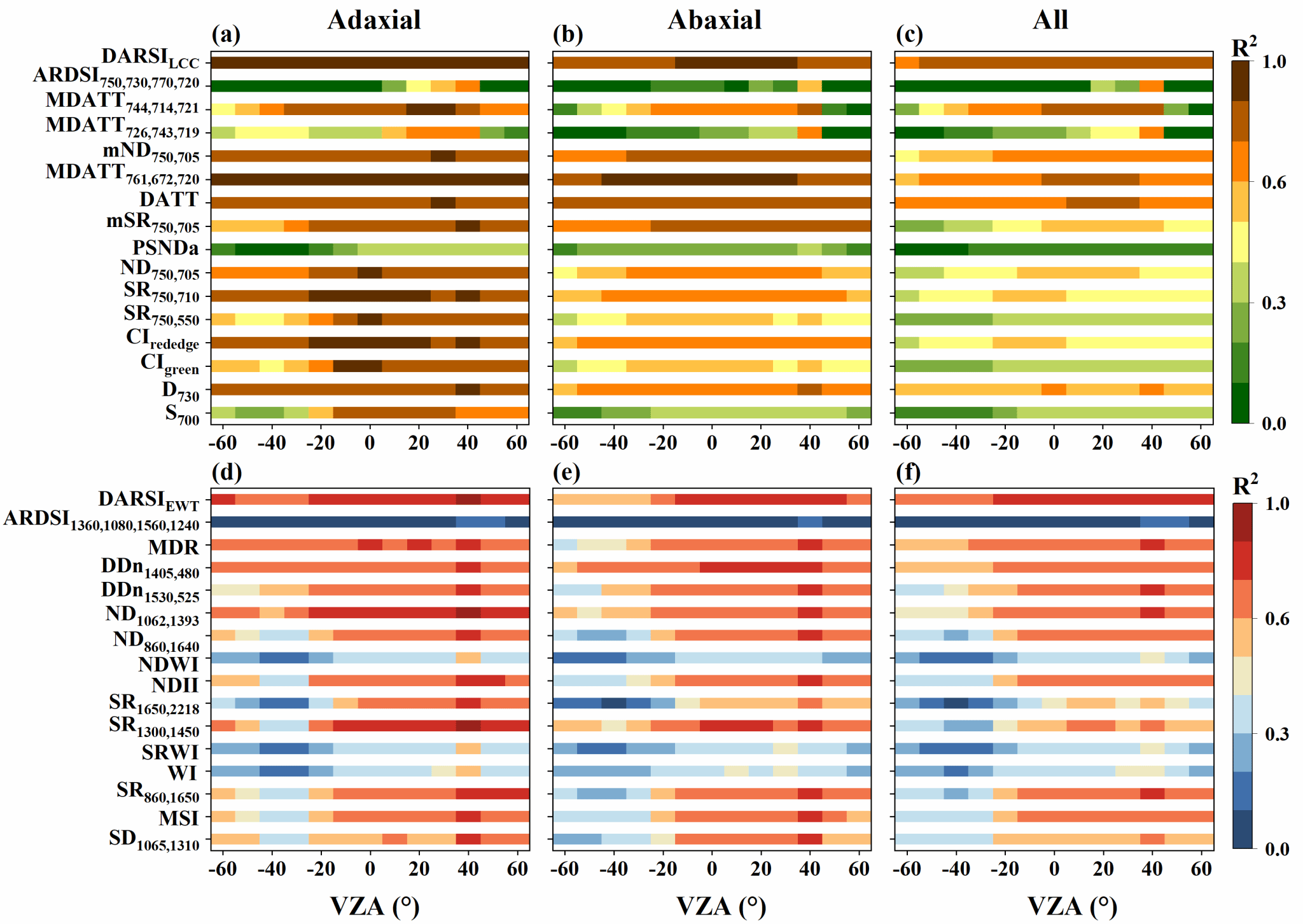 图2. 不同观测天顶角以及叶面条件下光谱指数与叶片生化参数之间的R²热图 (a-c) 叶绿素含量;(d-f) 等效水厚度