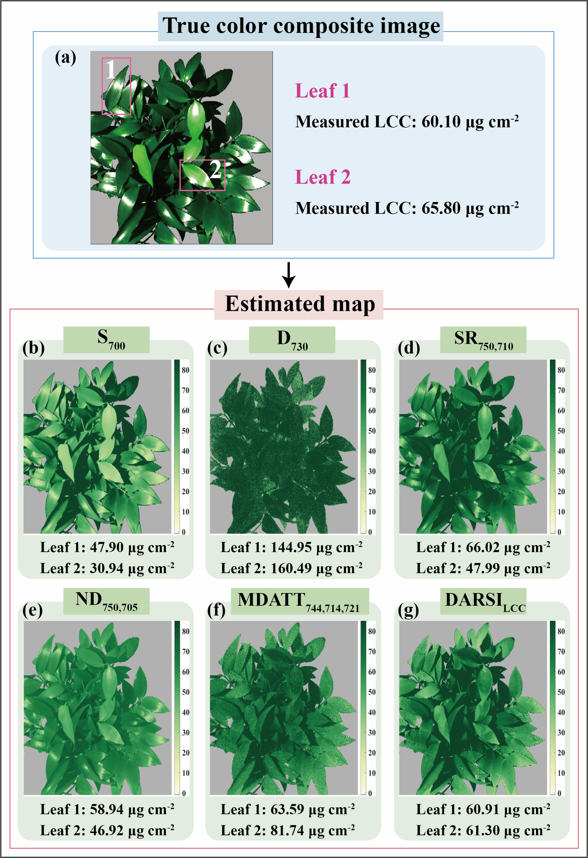 图4. Podocarpus nagi (Thunb.) Pilg.植物物种的真彩色合成图像 (a) 及利用不同光谱指数估算的叶绿素含量分布图 (b-g)