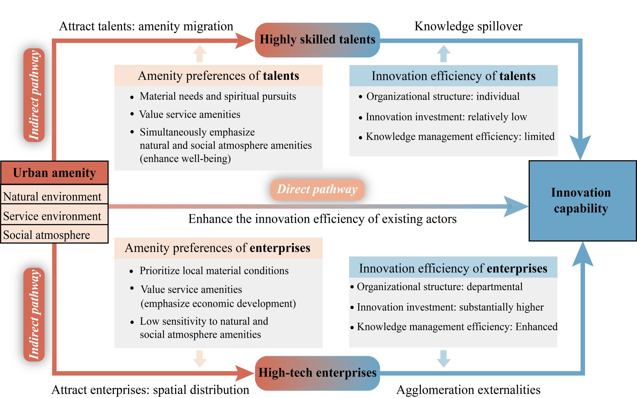 城市舒适性理论通过聚焦创新主体的需求,为解释城市创新发展机制提供了新的理论视角,有效弥补了传统创新理论过于侧重生产要素而忽视生活与环境因素的不足。既有研究表明,城市舒适性主要通过两种路径影响创新:一是直接路径,即改善现有创新主体的生活与工作环境,直接激发其创新效率;二是间接路径,即通过吸引外部高技能人才和高新技术企业集聚,间接提升区域创新能力。然而,现有研究对这两种路径,特别是间接路径内部机制的理解仍存在不足。