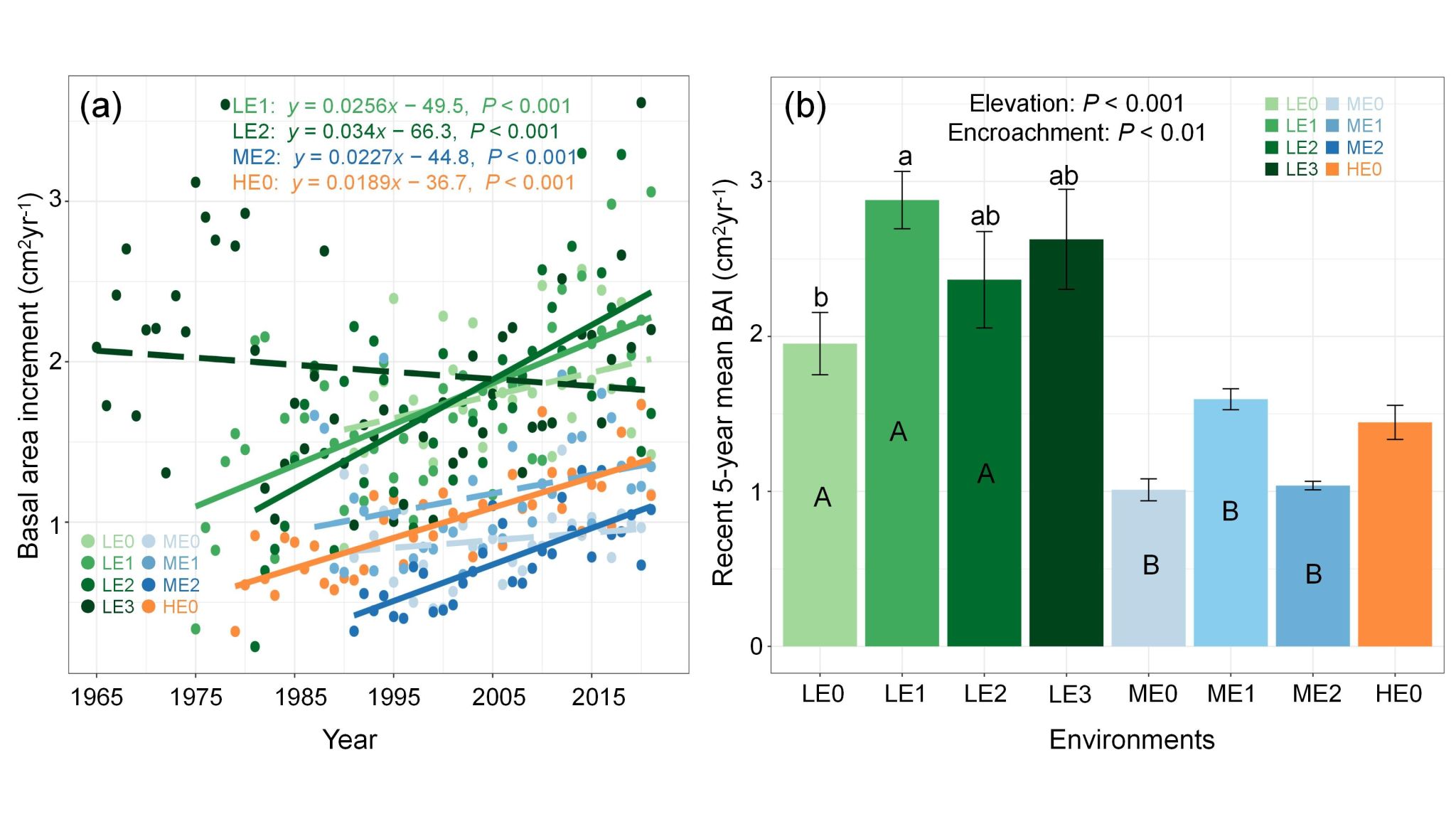 图1. 不同海拔、大叶章上侵梯度下,牛皮杜鹃基面积增量(BAI)的长期趋势和近五年平均值图