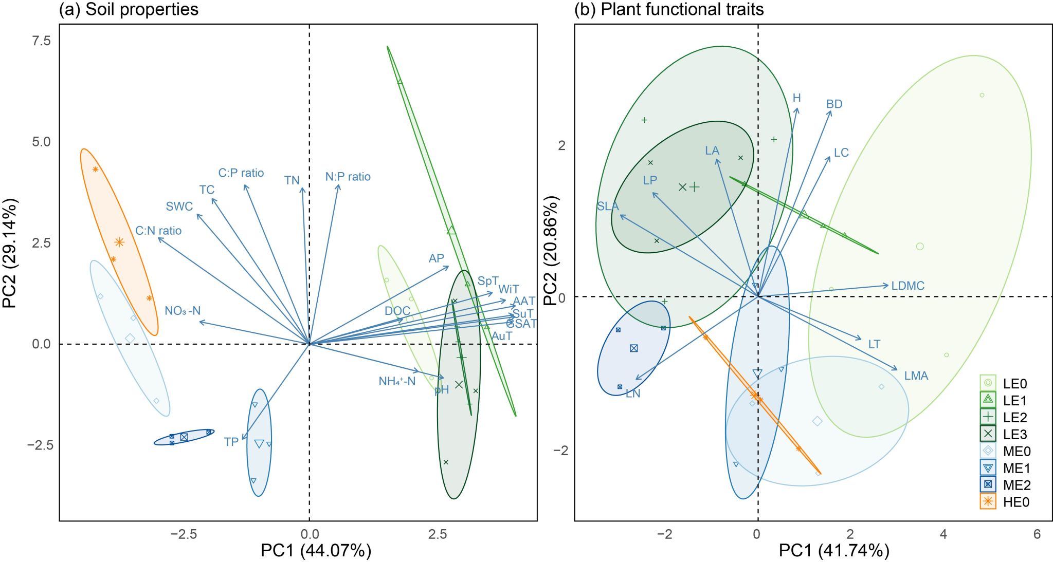 图3. 土壤特性和牛皮杜鹃功能性状的主成分分析图