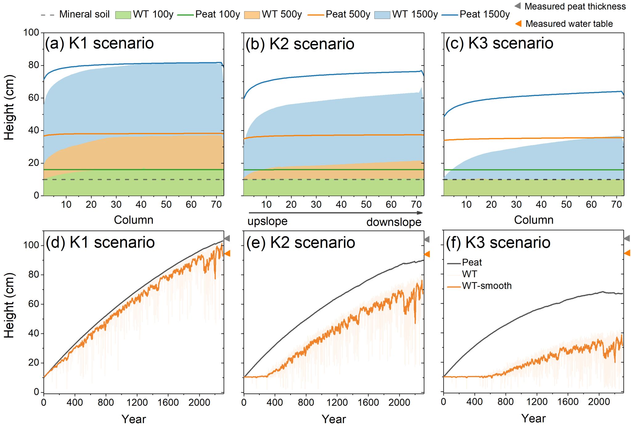 图3. 不同水力传导率情景下的泥炭积累与地下水位动态