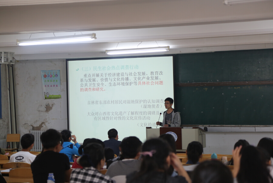 本次宣讲会由王家洪学长为同学们讲解暑期社会实践的各项内容,旨在让2015级学生对社会实践有更深刻的了解,以便更加高效地开展暑期社会实践。王家洪学长分别从活动流程、活动要求、项目类别、资助金额、上交材料的要求和资源获取途径六方面向同学们进行介绍,并结合往年优秀课题及调查形式给予同学们相应的建议。在宣讲过程中,同学们认真听讲并做好记录。在宣讲会结束后,同学们积极向王家洪学长询问关于暑期社会实践选题要求及申请书的撰写等问题。