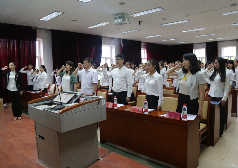鲜红的党旗,醒目的主题横幅,简而有力地渲染出庄重的气氛。宣誓大会由沈雯老师主持,以沉郁有力的《国际歌》开篇。在谷国锋老师致开会词后,赵琳老师带领全体党员进行宣誓。现场响起阵阵激昂的宣誓声,每位党员都真诚地抒发对党忠心,面对着党旗,大家接受了一次身心的洗礼。之后是2014级新党员代表赵黎以及2013级老党员代表牛彩澄分别代表新老党员进行了讲话,他们的演说词道出了所有党员的心声,表达了自己要恪守诺言,时刻保持共产党员的先进性和先锋模范作用,并努力使自己成为一名优秀共产党员的决心和信心。