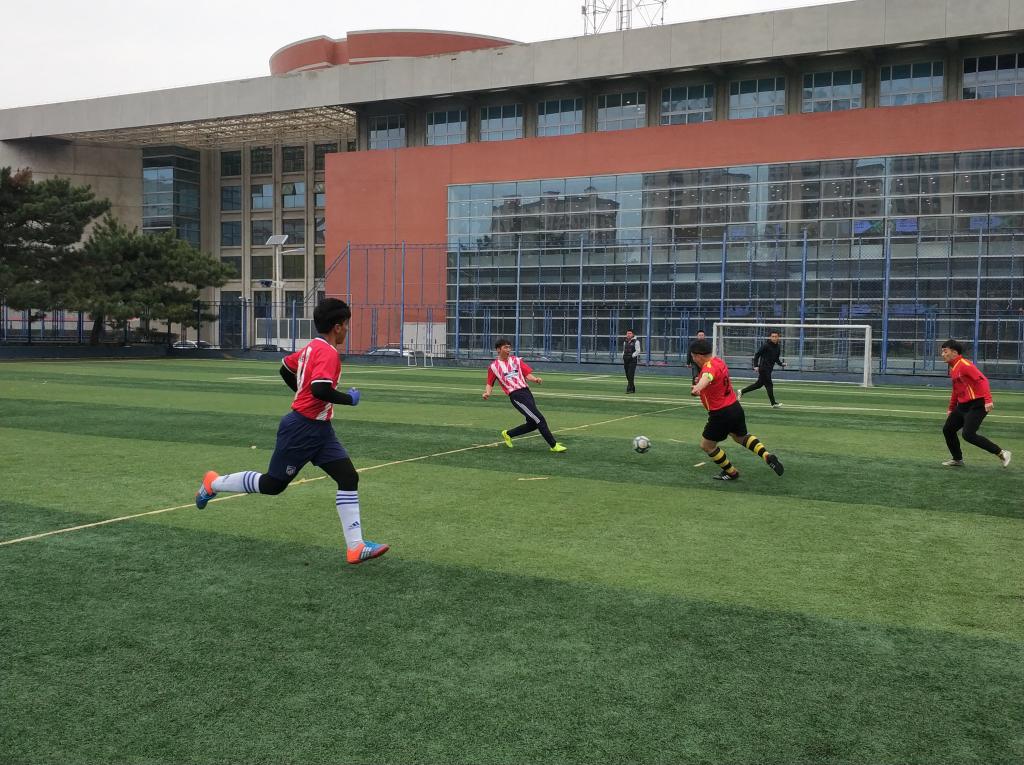 赛前两队队长分别带领着队员们进行准备活动,认真商量战术,接着双方队员轮流握手致意。比赛开始,队员们一上场就迅速进入了状态,奔跑不停,奋力追逐。大家互不相让,双方比分咬得很紧。中场休息时,队员们也不忘制定接下来的战术。下半场比赛依旧是一场龙争虎斗,两队队员都拼尽全力。球在运动员们的脚下来回转移,球员们不断地进行进攻、防守,赛况非常激烈。最终,我院以5:3的优势取得胜利,本次比赛圆满结束。