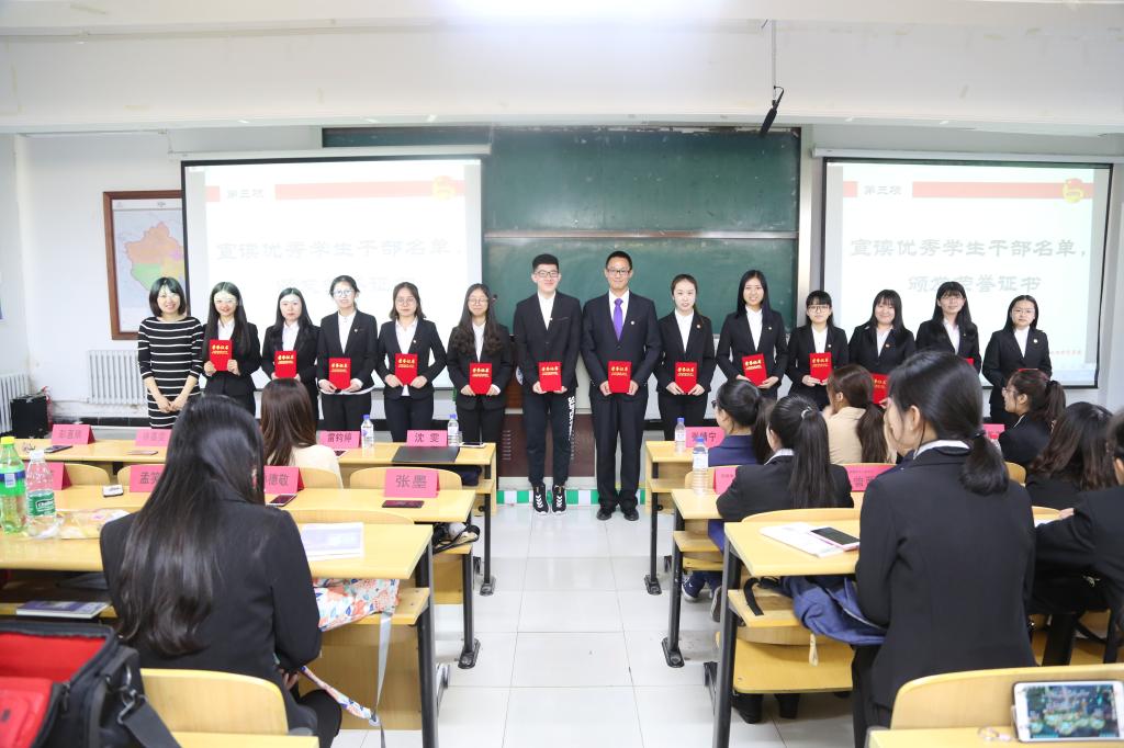 大会正式开始后,首先全体起立,奏国歌。之后,由我院第五届团委副书记左丽和第五届学生会主席李娜进行述职报告。然后,由沈雯老师宣读第五届团委学生会优秀学生干部名单,由王玉老师和沈雯老师为优秀学生干部颁发荣誉证书。在热烈的掌声中,沈雯老师宣读了我院第六届团委和学生会任命决定。团委副书记和学生会主席新老交接仪式后,新任团委副书记张腾腾和学生会主席王佩玉分别进行就职演说。随后,大家观看了第五届团委学生会及新媒体中心总结视频并由学生干部代表为第五届团委学生会及新媒体中心的学长学姐们送上精心准备的礼物。最后,由第五届团委学生会所有成员为学长学姐们共同献唱《仰望星空》。会议结束后,与会人员在学院门口进行合影留念。